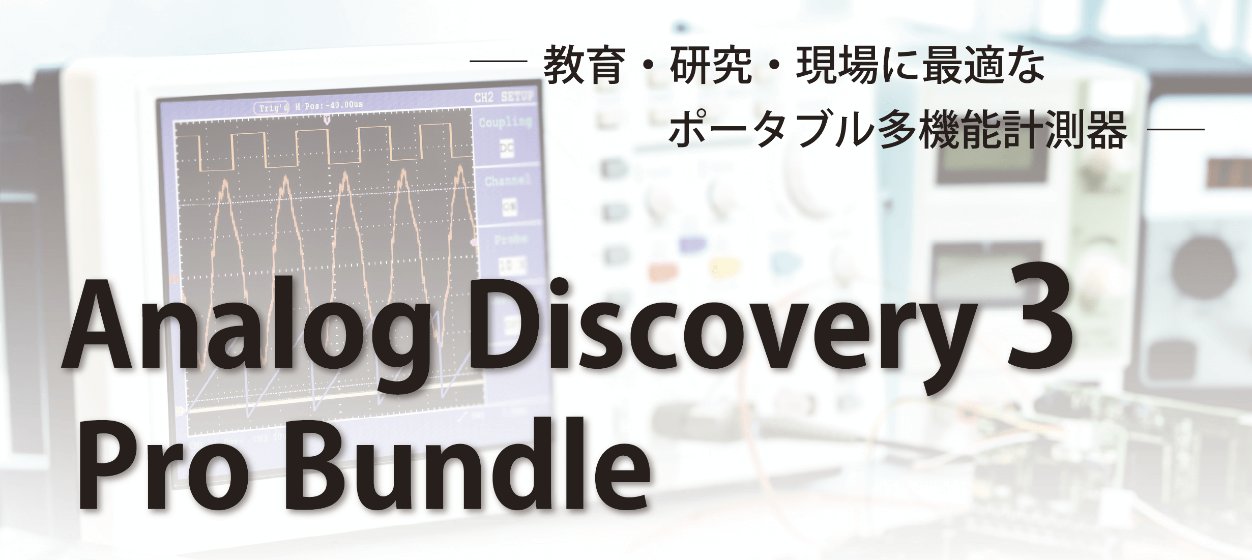 コンパクトで多機能なAnalog Discovery 3 Pro Bundle は、USB-C 接続でPCにつなぐだけで利用できる手のひらサイズの計測器です。オシロスコープ、任意波形発生器、ロジックアナライザ、プログラマブル電源など、複数の機能を1台に集約。教育現場から研究開発、製造ラインやフィールドワークまで、幅広いシーンで活用できます。