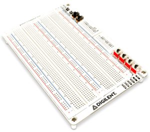 ブレッドボードキャンバスは、中型から大型回路に適した通常サイズの半田付け不要のブレッドボードを2つ備えた、大きなブレッドボード可能な表面を特徴としています。2つの小型ブレッドボードは、6つの利用可能な電源(3.3V、5V、±12V、±可変)への接続を提供し、同梱のI/Oへの接続も提供します。ブレッドボードキャンバスには、通常ブレッドボードしづらいコンポーネントに使いやすいインターフェースを提供するために、2つのスイッチ、LED、ボタンが含まれています。各電源はスライドスイッチを介してオンとオフを切り替えることができ、回路の電源を切ったり入れたりすることをできるだけ便利にします。電源の状態はパワーインジケーターLEDによって示されます。これは、アナログディスカバリースタジオに含まれているのと同じブレッドボードキャンバスです。