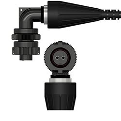 センサーで接地されたカスタム曲げ応力緩和付きの直角2ソケットMILコネクタ、ENTEK/IRD 7ピンLEMO®コネクタに接続可能、250°F(121°C)
