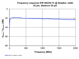 ICR RFプローブヘッドの測定コイルは、測定面に対して水平に配置されています。プリアンプはプローブハウジングに統合され、バイアスティーによって電源が供給されます。ICR近接場プローブは、配達前に品質チェックを受けます。異なる基準セットアップ測定が行われ、その結果修正ラインが生成されます。標準化された修正ラインとHフィールド修正ラインの2つの異なる修正ラインが決定されます。