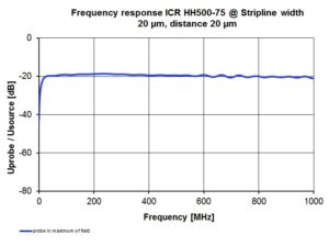 ICR RFプローブヘッドの測定コイルは、測定面に対して水平に配置されています。プリアンプはプローブハウジングに統合され、バイアスティーによって電源が供給されます。ICR近接場プローブは、配達前に品質チェックを受けます。異なる基準セットアップ測定が行われ、その結果修正ラインが生成されます。標準化された修正ラインとHフィールド修正ラインの2つの異なる修正ラインが決定されます。