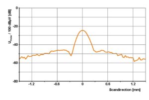 ICR RFプローブヘッドの測定コイルは測定面に垂直に配置されています。プリアンプはプローブハウジングに統合されており、バイアスティーによって電源供給されています。ICR近接場プローブは納品前に品質チェックを受けます。異なる基準配置測定が行われ、その結果に基づいて補正線が生成されます。三種類の補正線が決定されます - 標準化された補正線、Hフィールド補正線、および電流補正線。