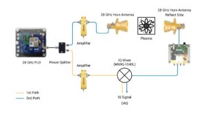 この技術は、PLOからの28 GHz信号を2つの経路に分離することで機能します。最初の経路では、信号はパワースプリッターとアンプを通り、IQミキサーのLOポートに入ります。第2の経路では、信号はプラズマと相互作用した後、電力分割器と増幅器を経由してIQミキサーのRFポートに送られます。ホーンアンテナはプラズマからの反射信号を受信し、BBoardを使って位相を調整します。補正された信号はIQミキサーに送られ、2つの28GHz信号の位相差を計算します。