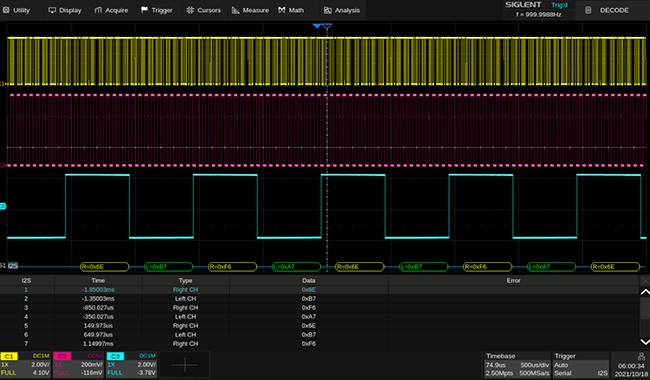 シリアルバストリガ/デコーダ、I2C, SPI, UART, CAN, LIN, CAN FD, FlexRay, I2S, MIL-STD-1553B, SENT, Manchester プロトコルをサポート