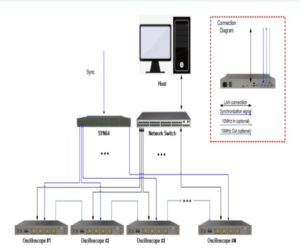 64チャンネル同期分配器SYN64からの低スキューの同期信号をトリガとして、複数のユニットを組み合わせて最大512チャンネルの高速アクイジション・システムを構築