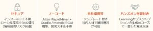 | 1 | Altair®AlStudio | データ処理・チャットボット構築・RAGロジック設計 | DAUnit提供 |