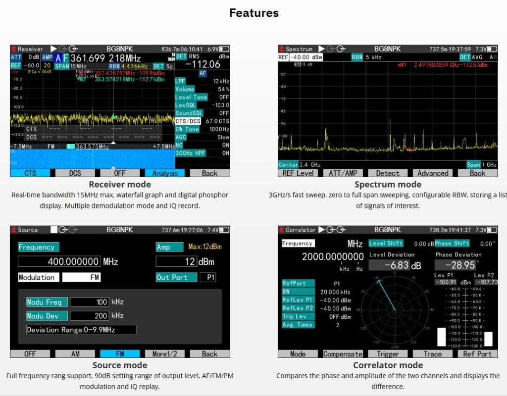 KC908はSDR構造に基づいています。他のPCベースのSDR受信機とは異なり、KC908は完全なデジタル信号処理ユニットとユーザーインターフェースを統合しており、PCを使用せずに動作可能です。またKC908はHDSDRなどのSDRソフトウェアをサポートしており、GNURadioにも接続できます。高速スイープは1秒間に3GHzの帯域幅で行え、周波数分解能は10kHzで、これは25kHzのチャンネル120,000個に相当します。300〜500MHzのスイープは0.1秒未満で完了します。マイクロサイズのハンドヘルド機器でこれほどの性能を誇れることを誇りに思います。信号源機能は、RF信号を生成したり、IQファイルを全周波数範囲で再生することが可能です。